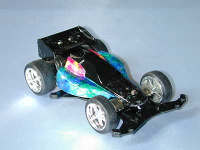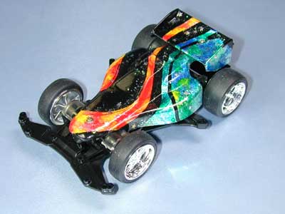 流れの部分は、アクリル絵の具透明タイプで彩色し、純銀箔で裏打ち。 ポツポツしているのはネイルアート用のキラキラ。 クリアボディ塗装ならではの透明感と技法が持ち味。 北海道のSpiaさんのもとへ 20030326